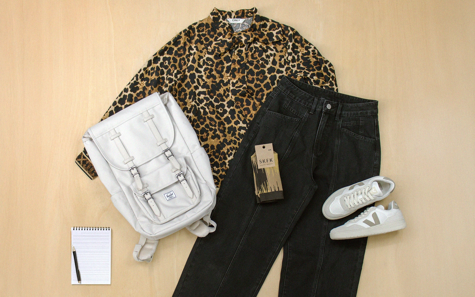 Look descontraído e sofisticado para o dia: Uma peça estampada num conjunto mais descontraído, perfeito para incluires este Print no teu dia a dia. Uma camisa elegante, estampada com umas calças de ganga modernas, uma sapatilhas creme, uma mochila e umas meias nos mesmos tons.