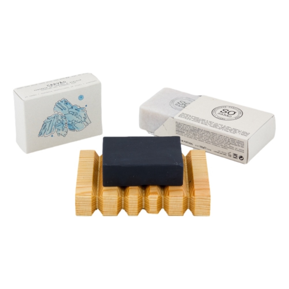 - Sabonete à base de azeite extra virgem e carvão ativado e aromatizado com óleo essencial de pinho.